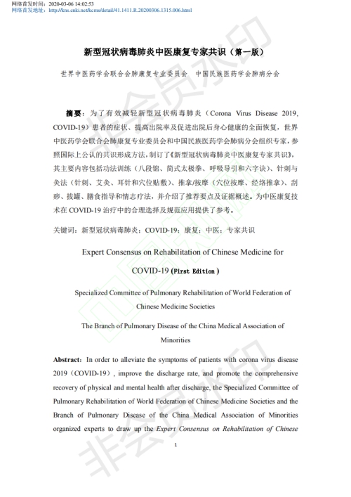 In order to effectively alleviate the symptoms of Covid-19 patients, improve discharge rate and promote the recovery of the body and mind after discharge, experts from the Pulmonary Rehabilitation Specialized Committee of the World Federation of Chinese Medicine Societies and the Branch ofPulmonary Disease of China Medical Association of Minorities, led by Professor Li Jiansheng of our university, reached “Expert Consensus on Rehabilitation of Chinese Medicine for Covid-19” with internationally recognized consensus formation method. Its main contents include skill training (Baduanjin, Simplified Tai Chi, respiratory guidance and six character formula), acupuncture and moxibustion (acupuncture, moxibustion, auricular acupuncture and acupoint application), manipulation/ massage (acupoint massage, meridian massage), scraping, cupping, dietary guidance and emotional therapy. The main points of recommendation and the summary of evidence are also included. Journal of Chinese Medicine published the consensus on the Internet on March 6th (approved on March 2nd), which provided a reference for the rational selection and standardized application of TCM rehabilitation technology in the treatment of coronavirus. Professor Li Jiansheng's “Expert Consensus on Rehabilitation of Chinese Medicine for Covid-19” (First Edition) is forwarded here for reference.
